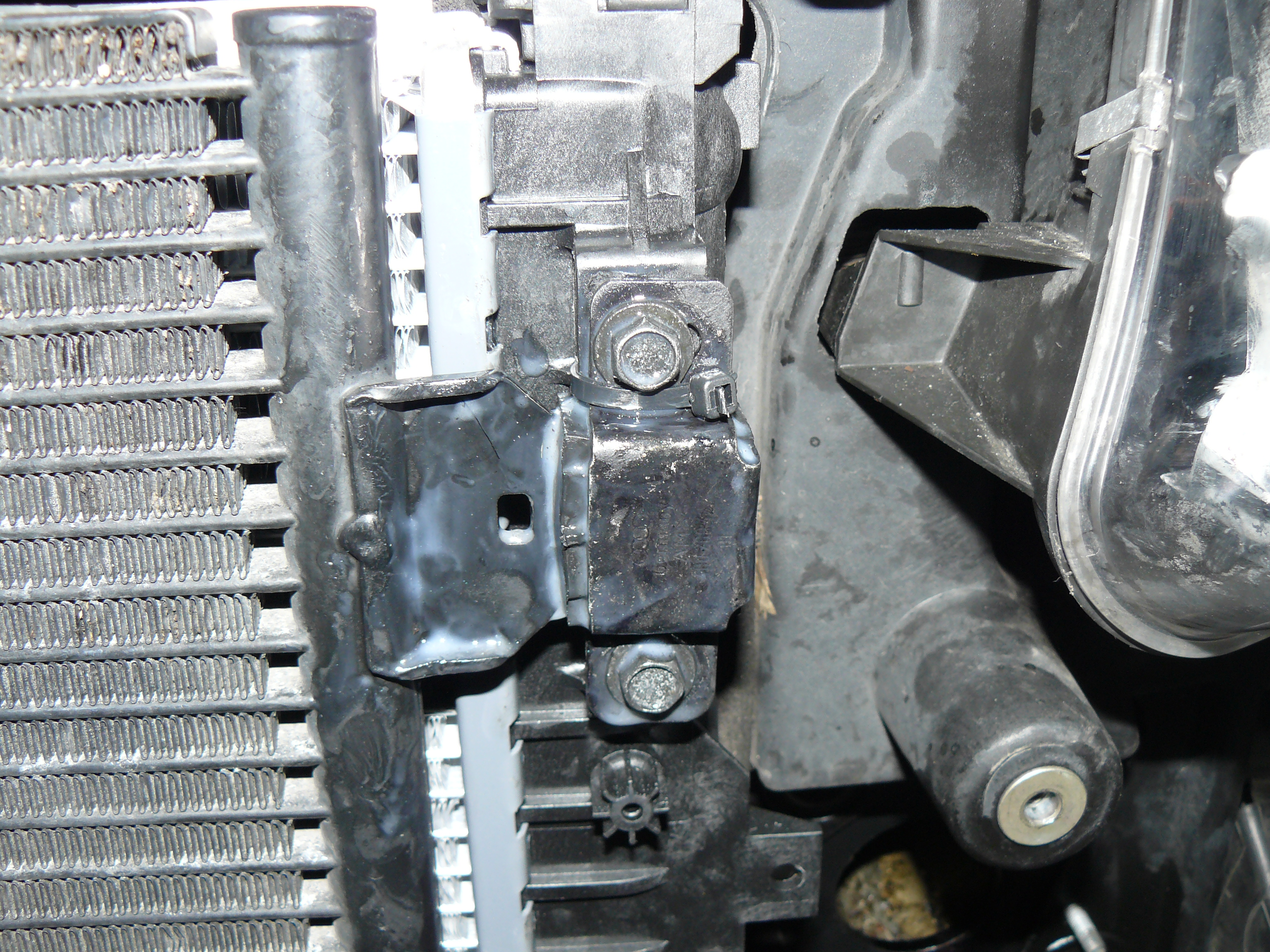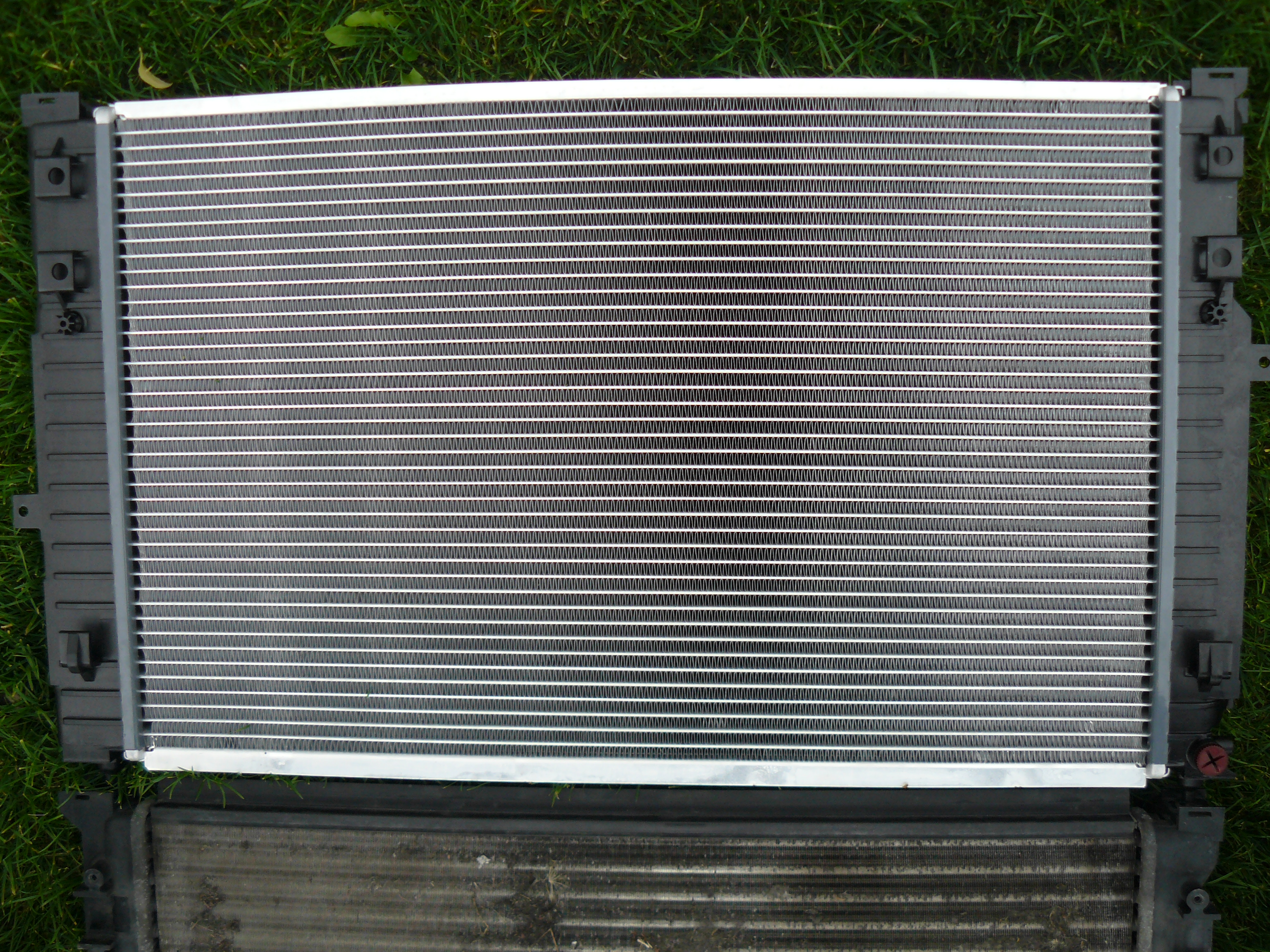 Einen Nachteil hat der Behr aber doch: am OEM Teil gibt es pro Seite oben je zwei "Zylinderchen" auf den Plastik-Seitenteilen. Da hinein schraubt man Blechschrauben und sichert so den Klimakondensator mit den Halteschellen. Beim Behr-Kühler sind da lediglich Löcher in einer Plastikplatte, so dass man eine Schraube mit Unterlegscheiben und Mutter verwenden müsste, was wegen der Enge nicht leicht ist. Außerdem hatte ich diese Schrauben/Muttern natürlich nicht mitbestellt!