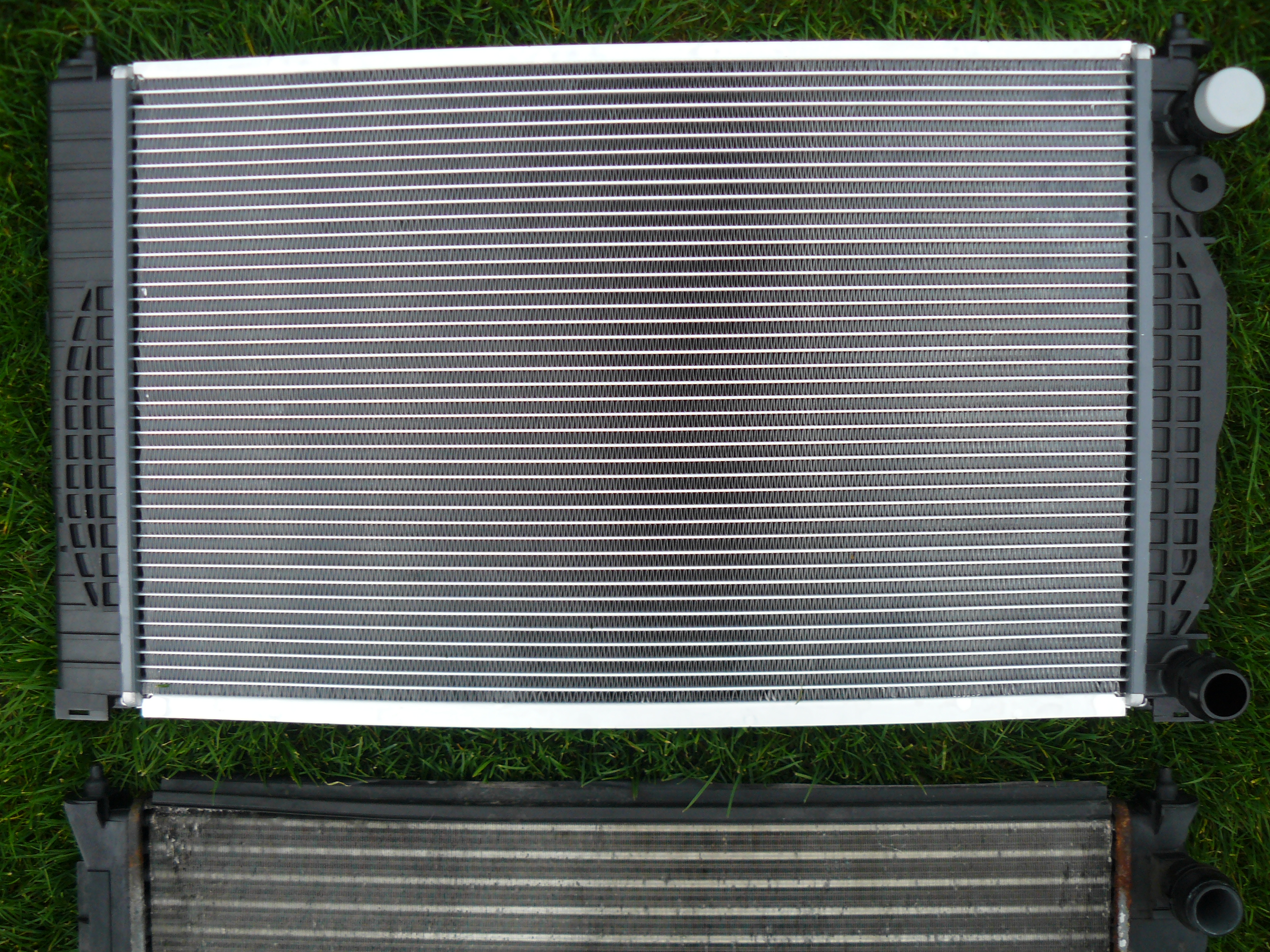 Der Behr Kühler ist tatsächlich viel robuster gebaut und etwas tiefer, wie ich meine. Er hat auch keine solche Gummilippe, wie sie der OEM hatte. Zwar sind beim Behr die Kühlrippen oben und unten auch "fixiert", um Ermüdungsbrüche durch Vibrationen zu vermeiden (?), jedoch nur per horizontaler Alu"platte", so dass die Kühlrippen nicht im Wasser, Salz, Dreck stehen. Die umfassende Lippe des OEM Teils war diesbzgl. eine Fehlkonstruktion, da die Rippen in einer Rinne standen, zusammen mit dem Wasser/Salz/Dreck und deshalb weggammeln.