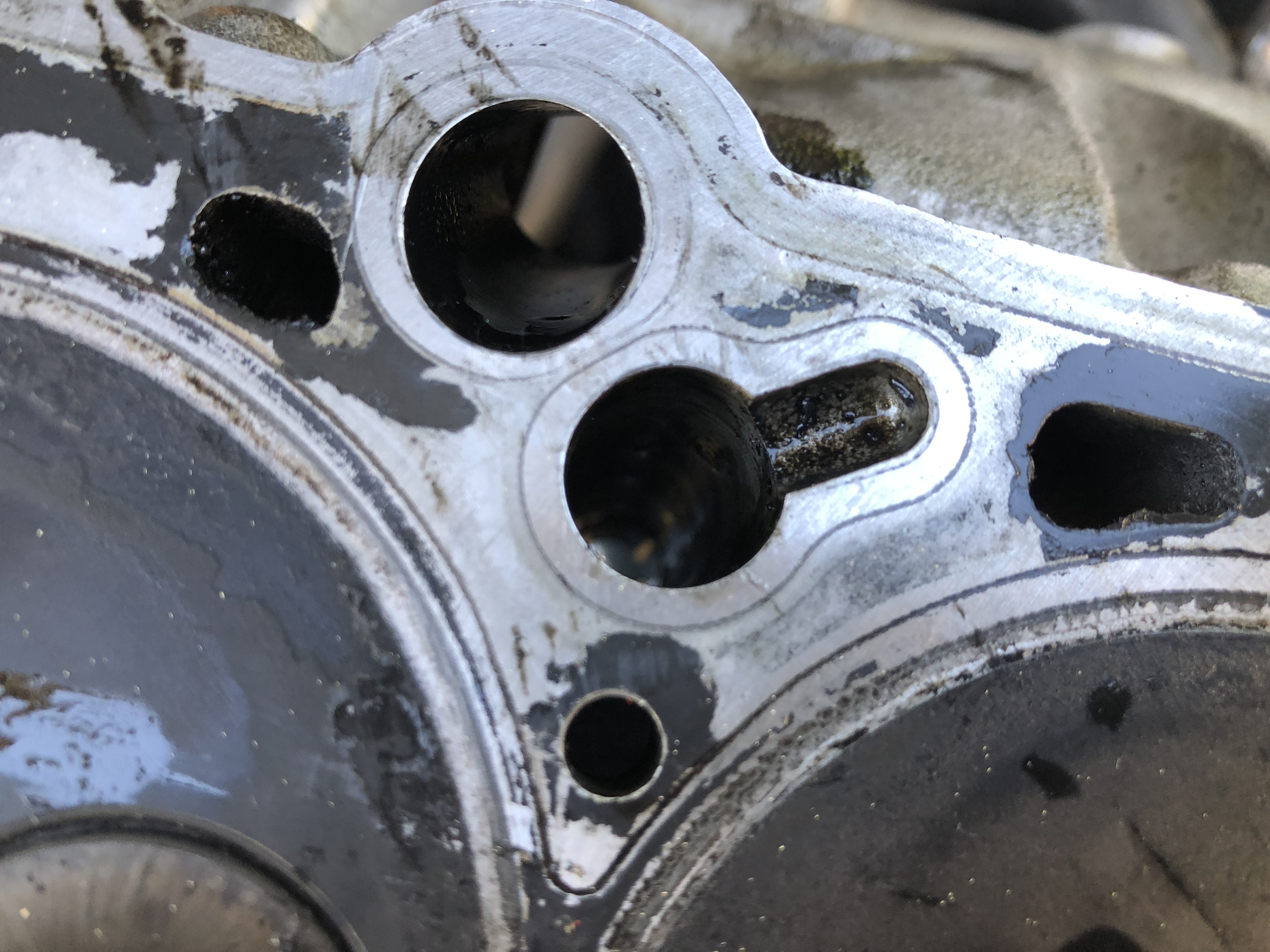 Durch die kleine Freilegung/Kanal geht das Öl in den Ringspalt zwischen Kopfschraube und Bohrung. Im oberen Bereich der Bohrung geht wieder seitlich eine Bohrung in den Hauptkanal des Zylinderkopfes.