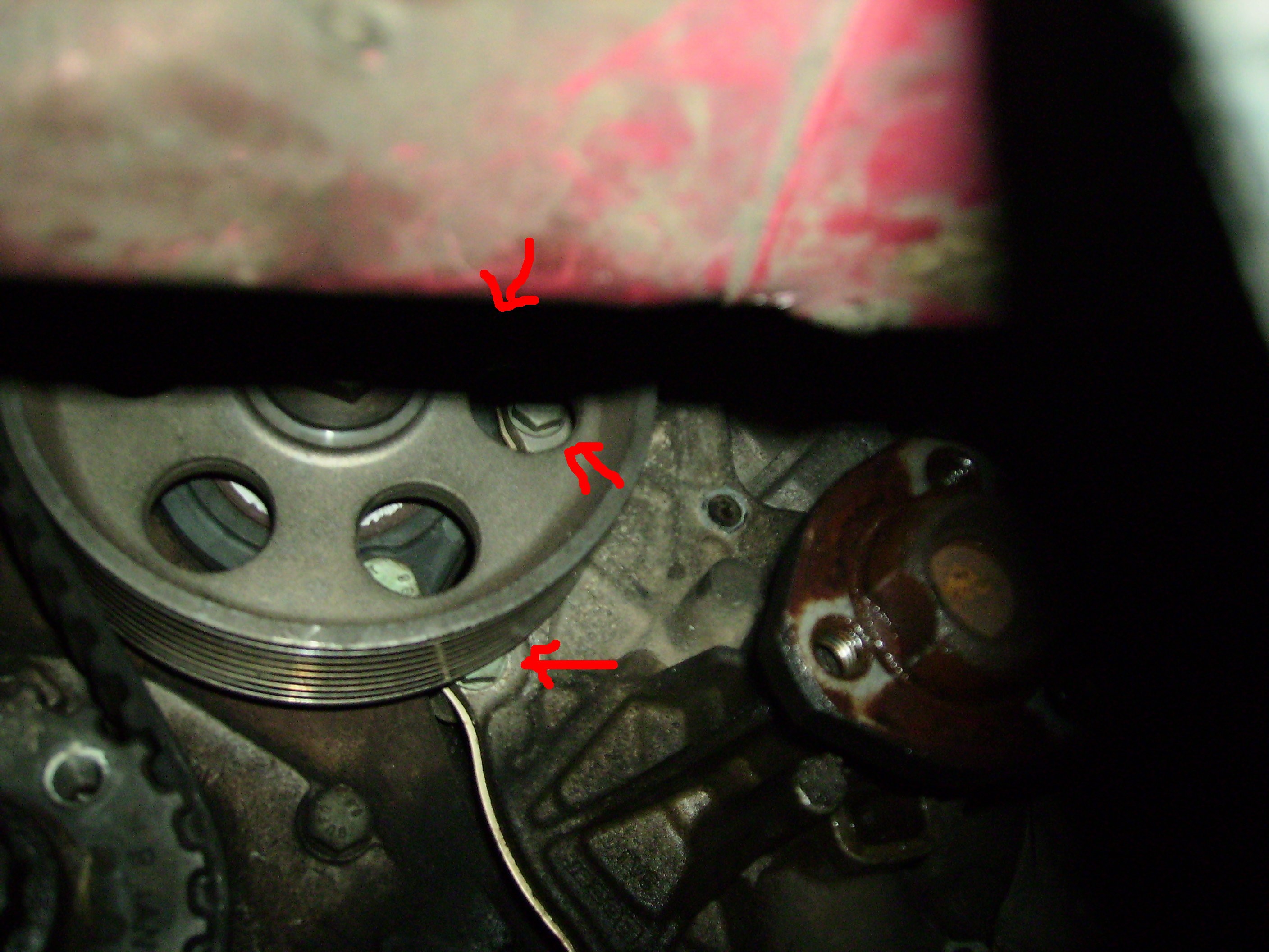 Zahnriemenverkleidung ist ab, nur wie gesagt sind Schrauben der Pumpe (Antriebsscheibenseitig) von einer Rolle wo der Zahnriemen rückseitig drüberläuft abgedeckt. Diese Rolle läuft so dicht an der Pumpe entlang, dass die Pumpe auch nicht herausnehmbar wäre, da die besagte Rolle direkt davor sitzt.