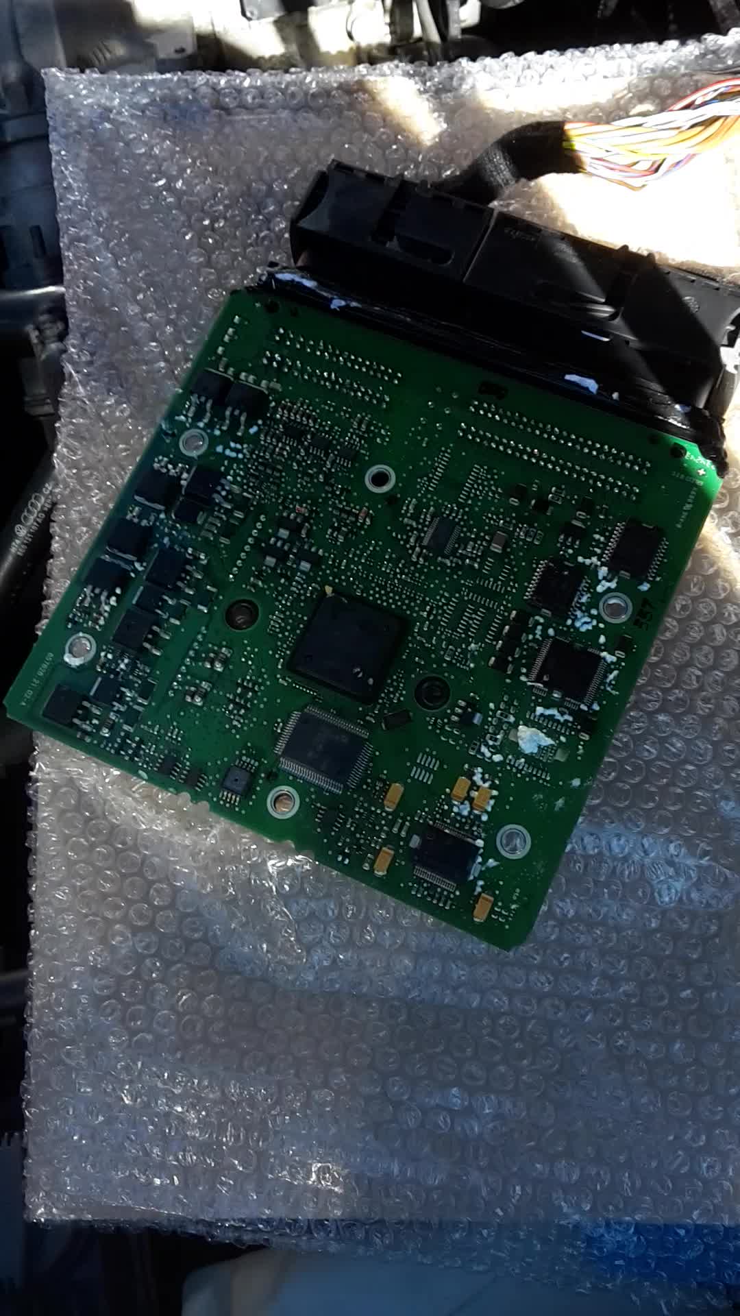 Ich habe aber festgestellt, wenn ich das Motorsteuergerät bewege der Fehler auftritt. Als nächstes habe ich das Steuergerät zerlegt und es ist wirklich so das wenn man die Platine bewegt der Motor ausgeht. Eine Anfrage bei einer Reparaturfirma war negativ, sie können mir nicht garantieren das sie den Fehler im Stg. beheben können. Audi kann ein Stg. im Austausch (03G997058GX) liefern.